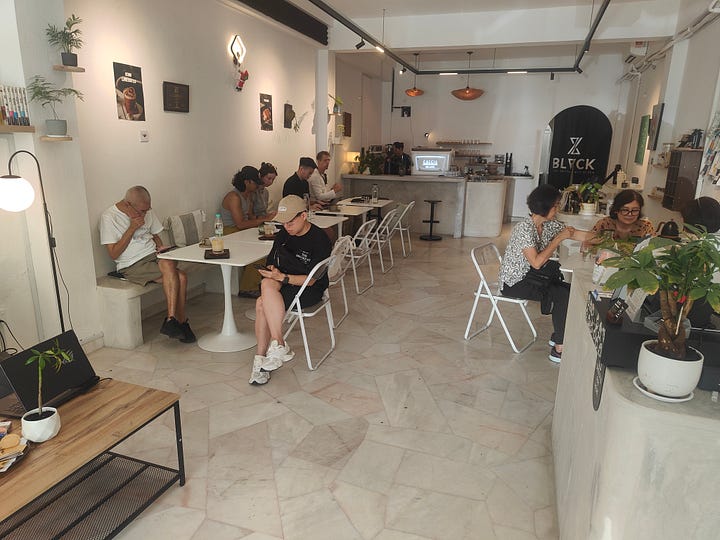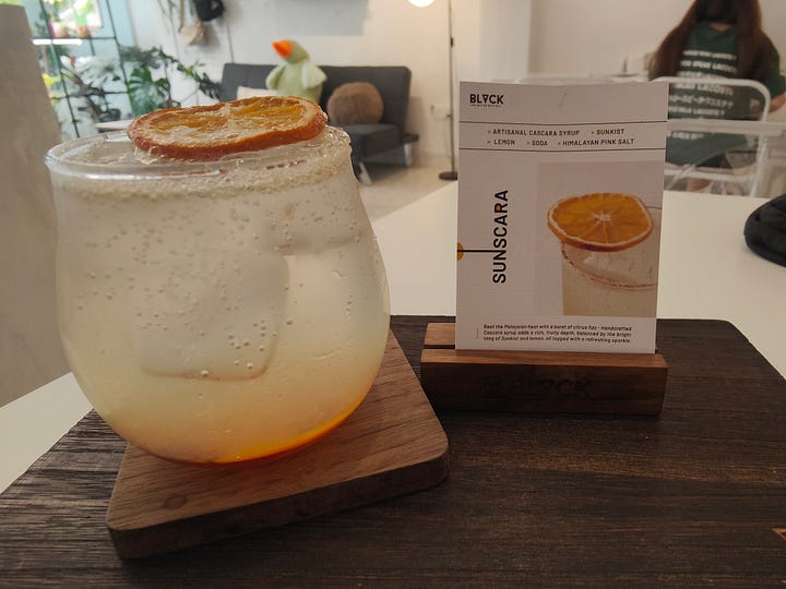 It turns out to be a great area to stay - the PP Hotel is quite nice, there are many other hotels around and several foodcourts, as well as a host of restaurants. I’m just off Jalan Macalister, which apparently has a reputation as a food street. I make a beeline to BLACK, a nearby specialty coffee shop - it becomes my regular. They make an interesting drink where the syrup (cascara) is extracted from dried coffee cherry husks, to which they add citrus flavours.