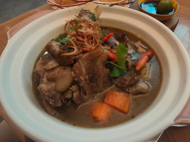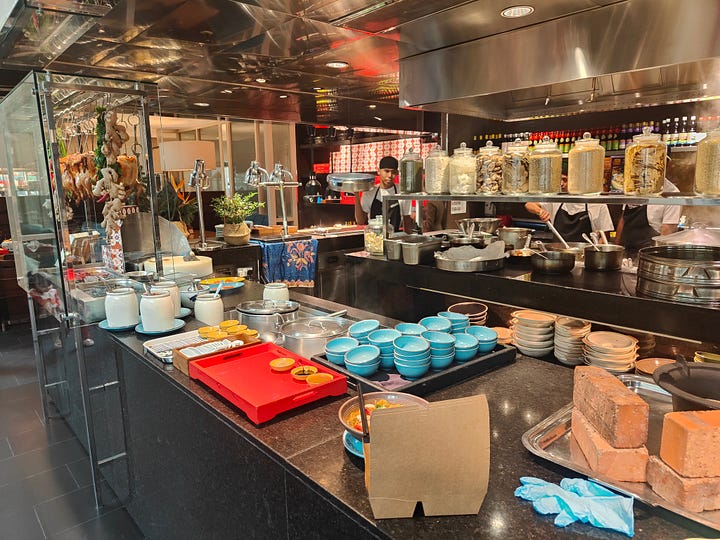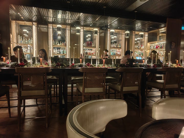 I often don’t do anything for Christmas, but this year I do a little more than mince pies, although things go a little wrong: I have a reservation at JP Teres at the Grand Hyatt for lunch. It’s a posh traditional Malaysian restaurant. My thinking is that I’ll have a leisurely buffet lunch and relax in the bar for a bit. It turns out the buffet is off, thanks to it being a public holiday and the bar doesn’t open until 6. There is an outside bar, but it’s too hot to drink there and no one offers me a drink with my meal. So I drink a lot of iced water, have satay and a spiced lamb stew. The white lumps with the satay are rice cakes - impervious to receiving any flavour from the satay sauce.