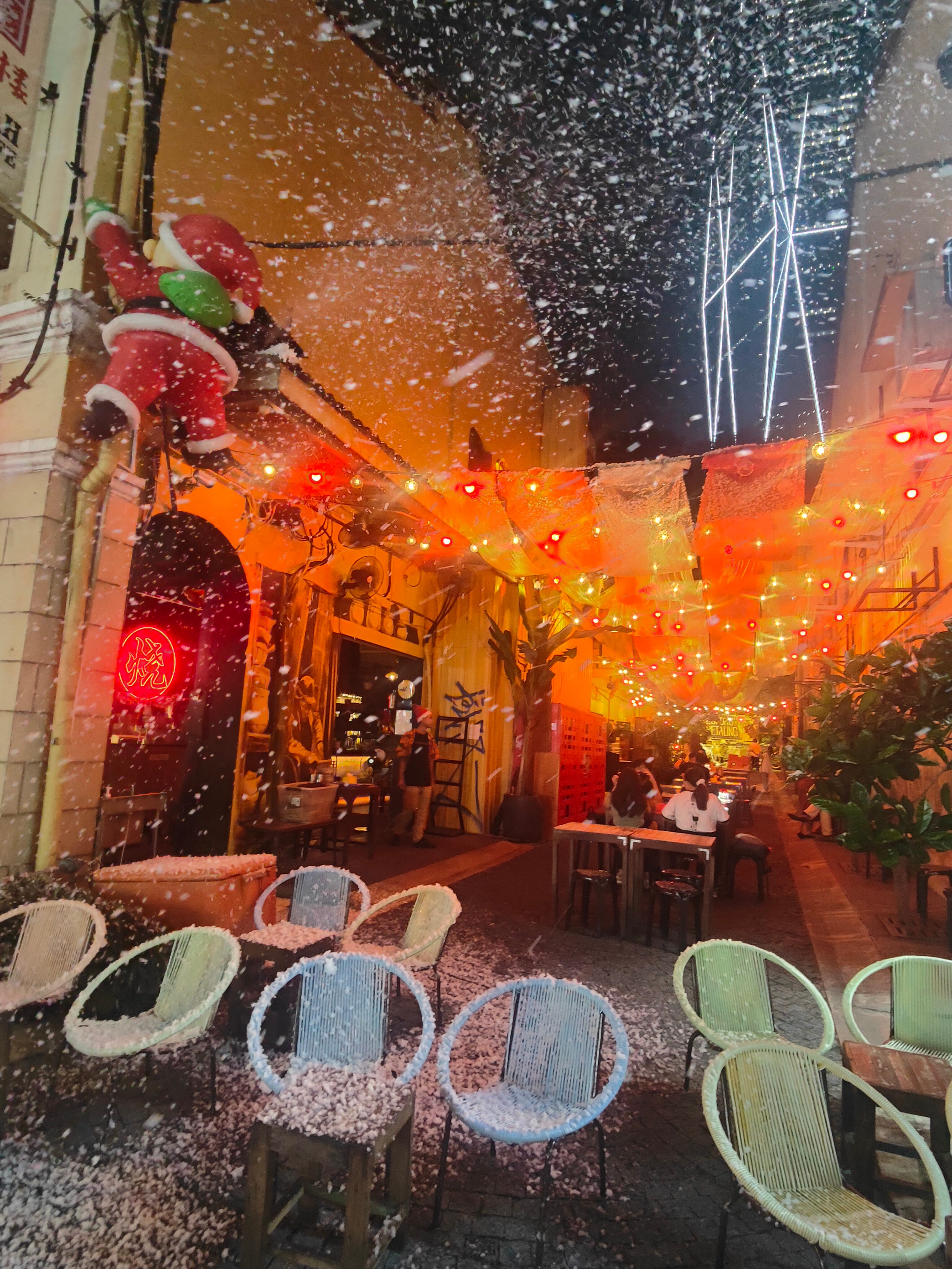 Going back to my hotel from the bar, I’m suddenly caught in a “snow” fall.