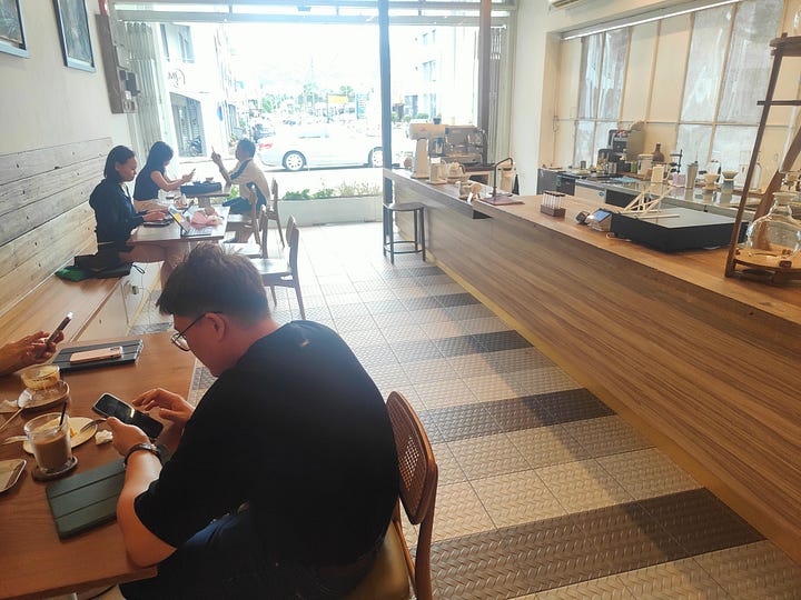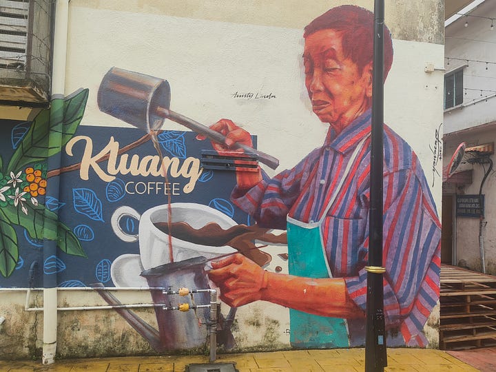 Wednesday (18th) I go in search of a coffee shop I visited last time. I’m quite hungry so stop for food at the first place I come across and make a poor choice: Thai chicken rice sounds nice (I’ve eaten a lot of chicken rice in Thailand) but this is not what I expected. There’s a nearby coffee shop showing up on the map, Kafe Kaki Lima, so I try it out - great coffee, very small space!