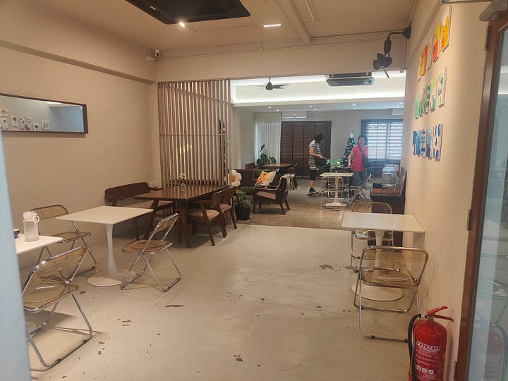 I miss the coffee shop I’m here for but see another on the map. Walking there, I have so much buyer’s remorse about my chicken rice, because I see several places that are doing a much better job. What I don’t see is The KōHii - would you expect to find a nice café in this lineup? It’s through a narrow doorway behind the rubbish bin and up a stairway - the menu is mainly Japanese but they have cake.