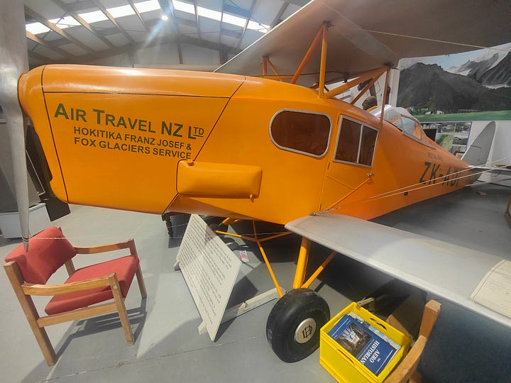 The next shed has quite a mixed collection - lots of sewing machines, set up to look like they might still be used for some purpose - along with a lot of random stuff and a replica airplane. New Zealand’s first air service (Air Travel (NZ) Ltd) was set up here in Hokitika - they had to carry the plane in and assemble it. Conditions here are pretty rugged: in the 1940’s, they crashed three planes, with six fatalities, including Bert Mercer, the owner. This plane is a replica De Havilland DH83 Fox Moth, the first plane in the Air Travel fleet. Three months after it started life, it hit a bull taking off in Fox Glacier, causing substantial damage to the plane (the bull’s state of health is not mentioned). It spent a couple of years in military service and then became part of the National Airways Corporation (a forerunner of Air New Zealand).